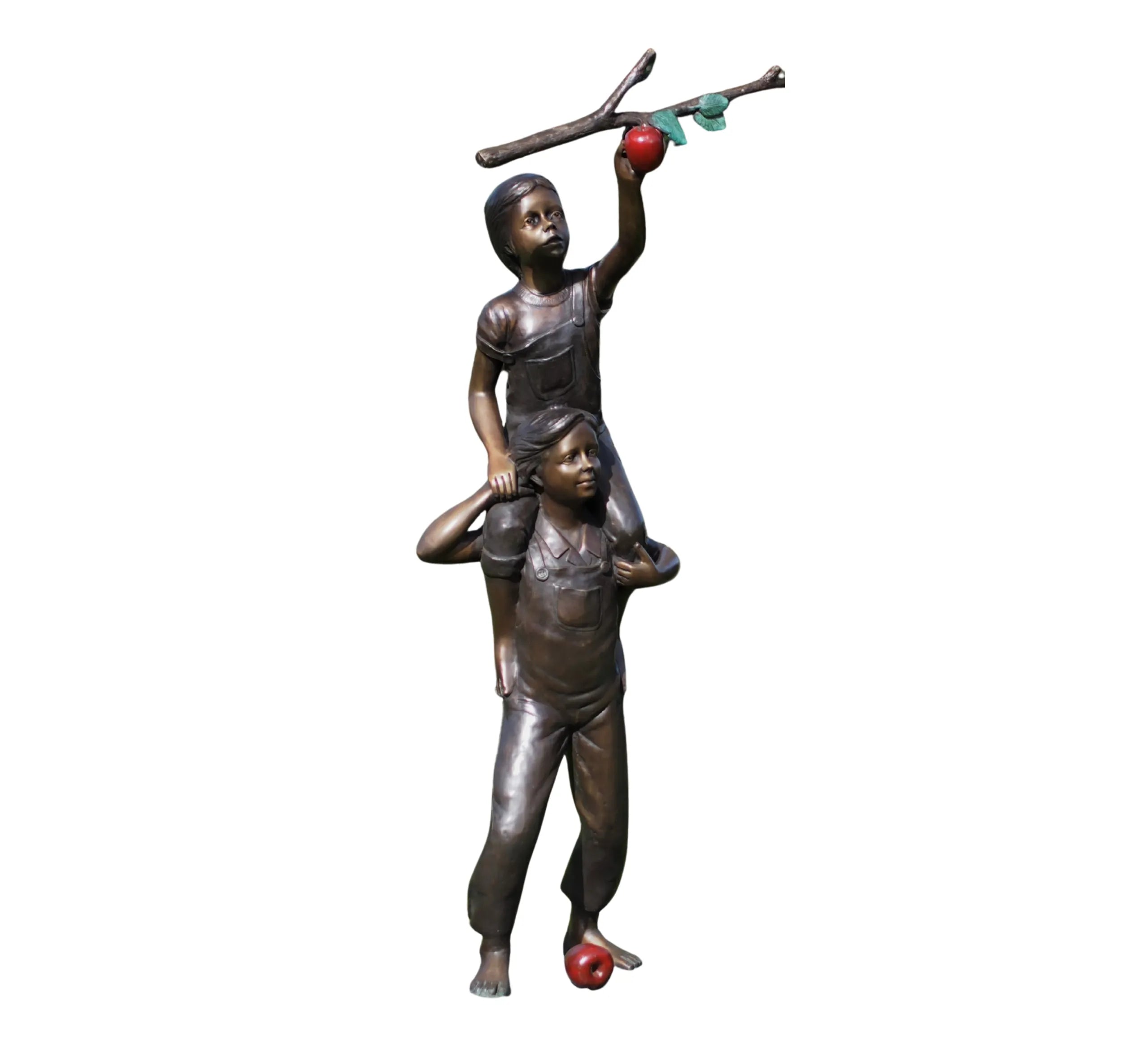 Apple Pickers is a playful bronze sculpture capturing a sweet moment between two young friends—where the girl, perched on the boy's shoulders, reaches up to pluck an apple. Symbolizing teamwork, joy, and youthful adventure, this charming piece brings life and warmth to any garden, orchard, or outdoor gathering space.