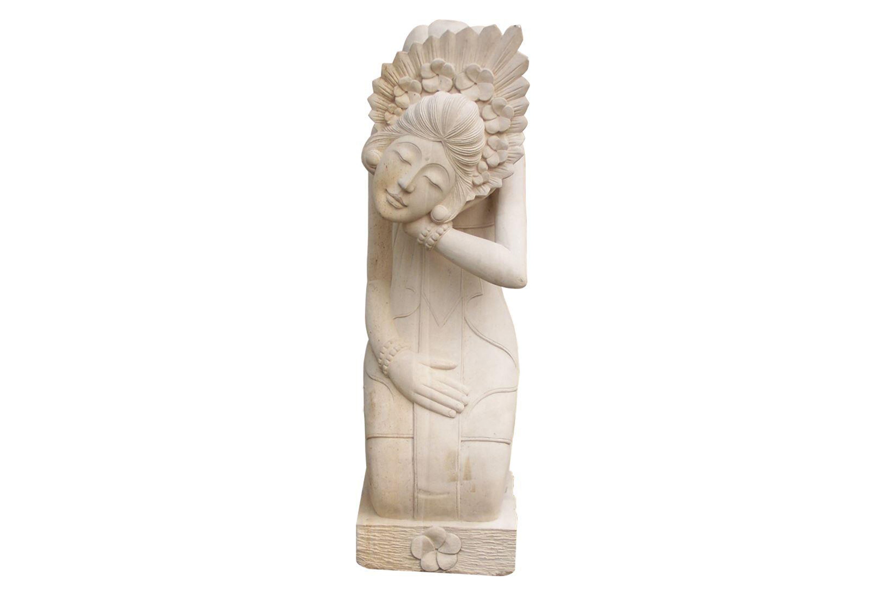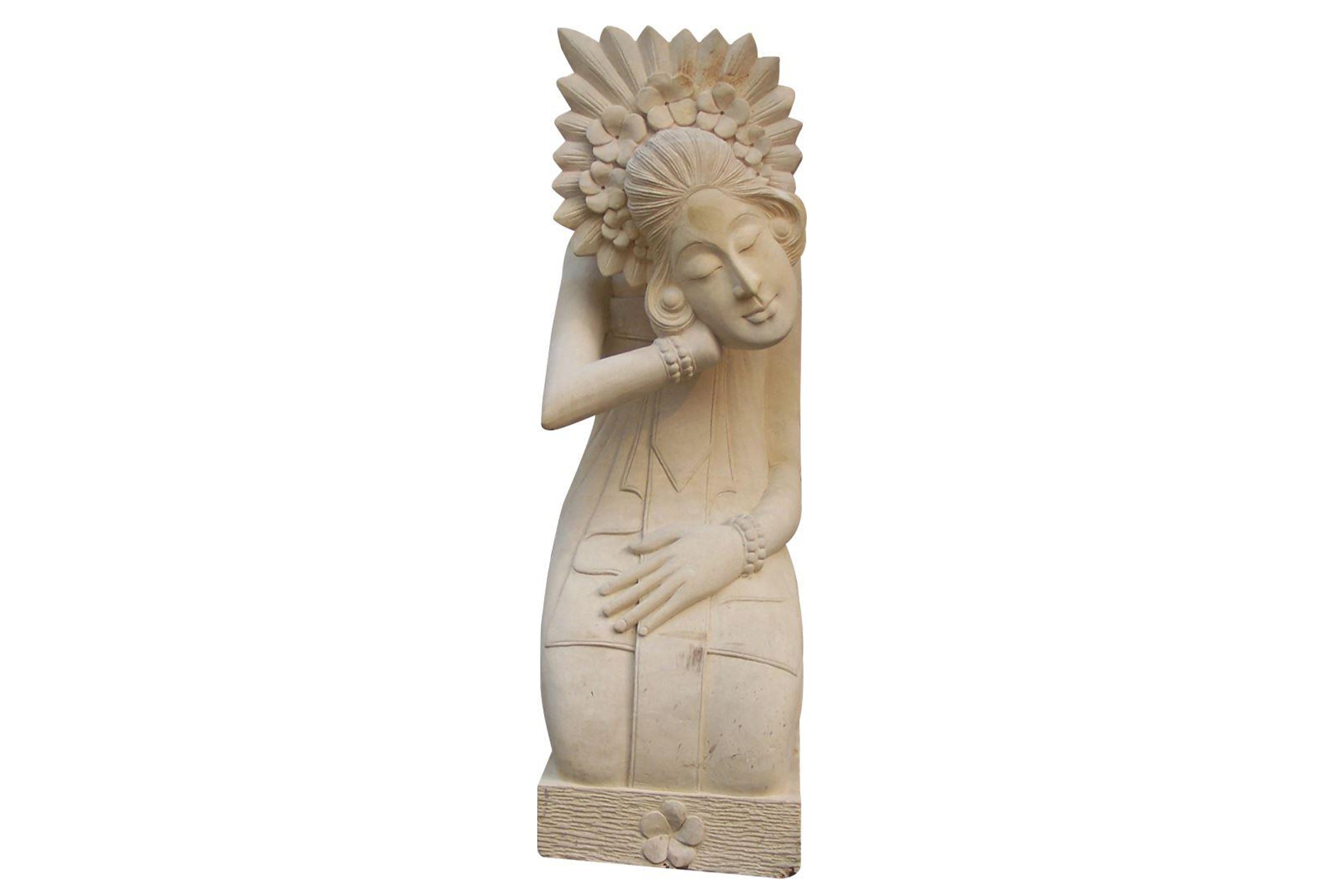This Balinese sandstone sculpture depicts a serene female figure with intricate floral details adorning her headdress, exuding a sense of tranquility and cultural elegance. The primitive modern style merges traditional craftsmanship with abstract simplicity. These are a perfect addition to your gardens or even lobbies.