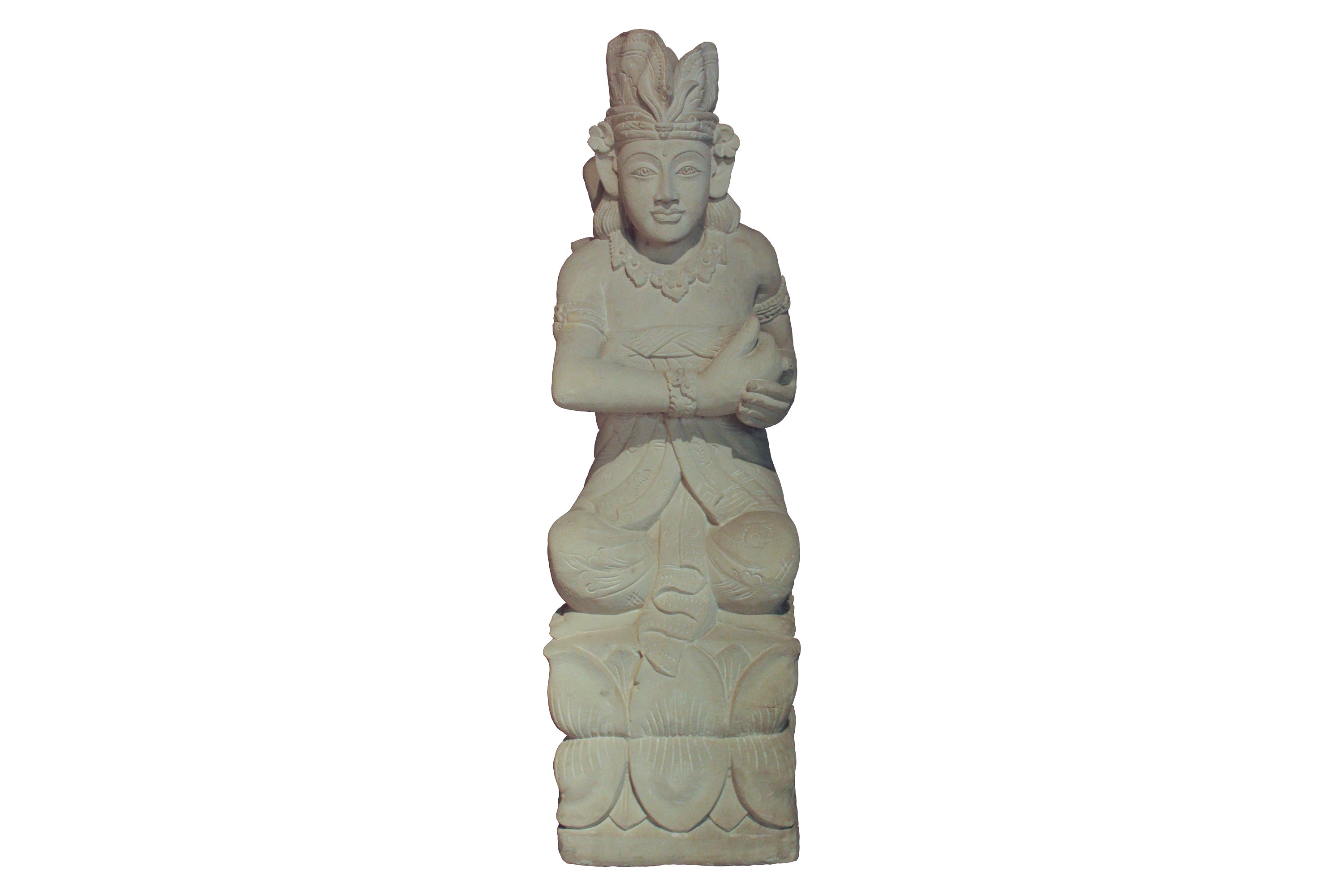 This Balinese sandstone sculpture depicts a serene female figure with intricate floral details adorning her headdress, exuding a sense of tranquility and cultural elegance. The primitive modern style merges traditional craftsmanship with abstract simplicity. These are a perfect addition to your gardens or even lobbies.