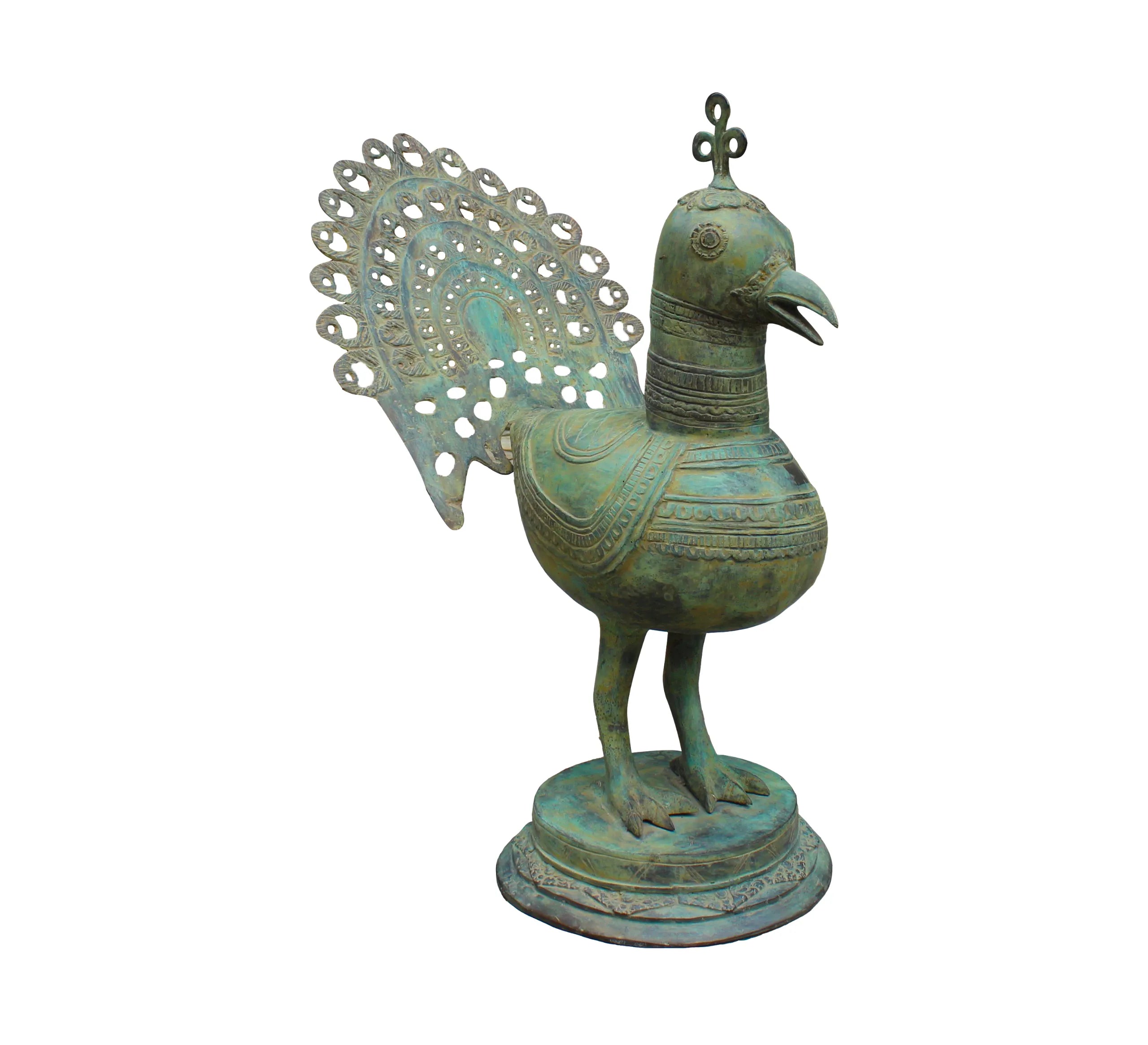 The Majestic Peacock is a bronze sculpture in an antique Indian style, featuring intricate detailing and a patina finish that gives it a timeless, regal appearance. The peacock is depicted in full splendor, with its feathers elegantly fanned out,
