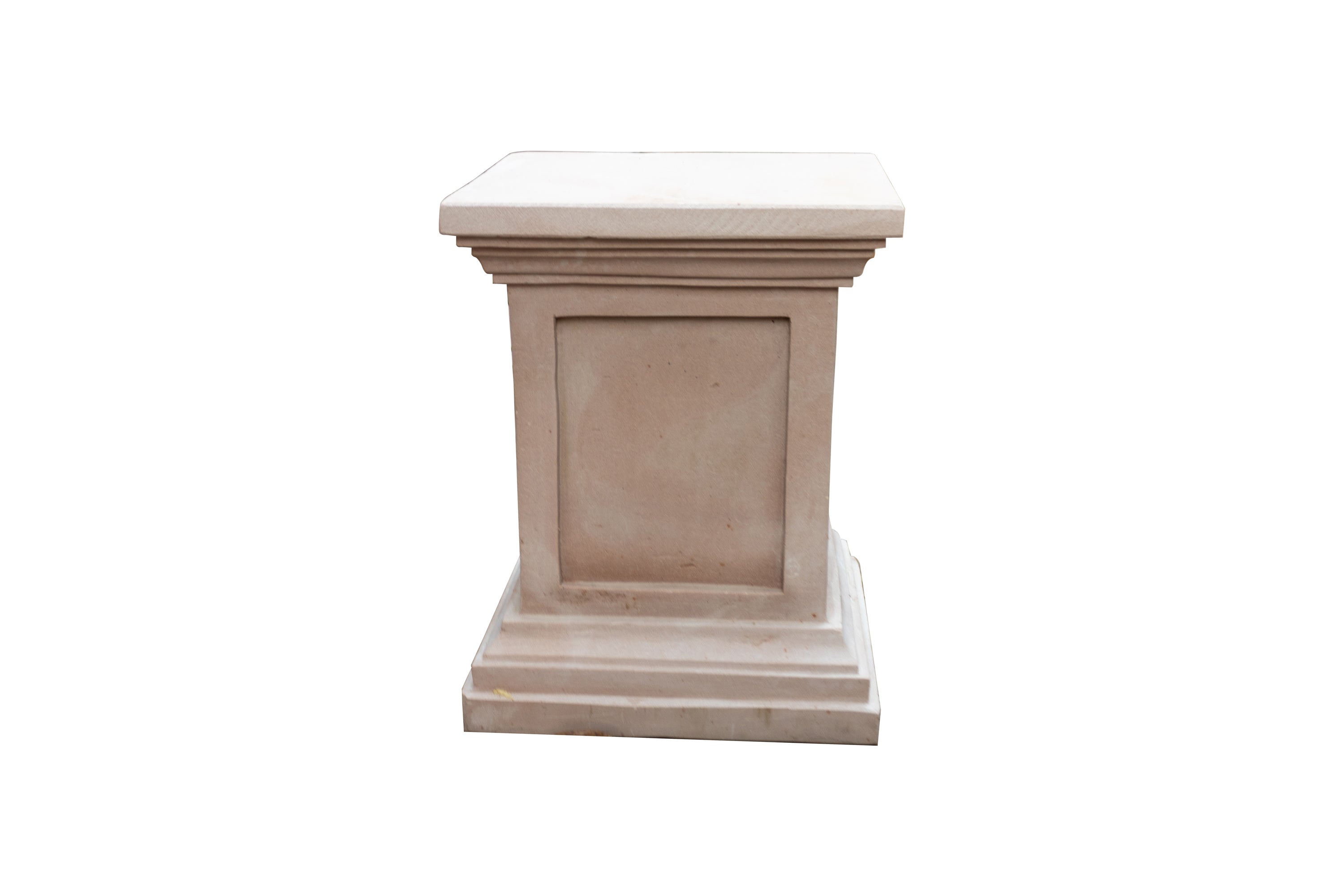 This pedestal is crafted from mint stone, a type of sandstone known for its subtle, warm, and earthy tone. The design is clean and geometric, with a square top and base that give it a solid, grounded appearance. The top features simple molding, while the main body has recessed panels on each side, adding a touch of depth and structure. The layered base elevates the pedestal, making it perfect for supporting a statue or art piece. Its minimalist and sturdy design would suit both modern and traditional settings.