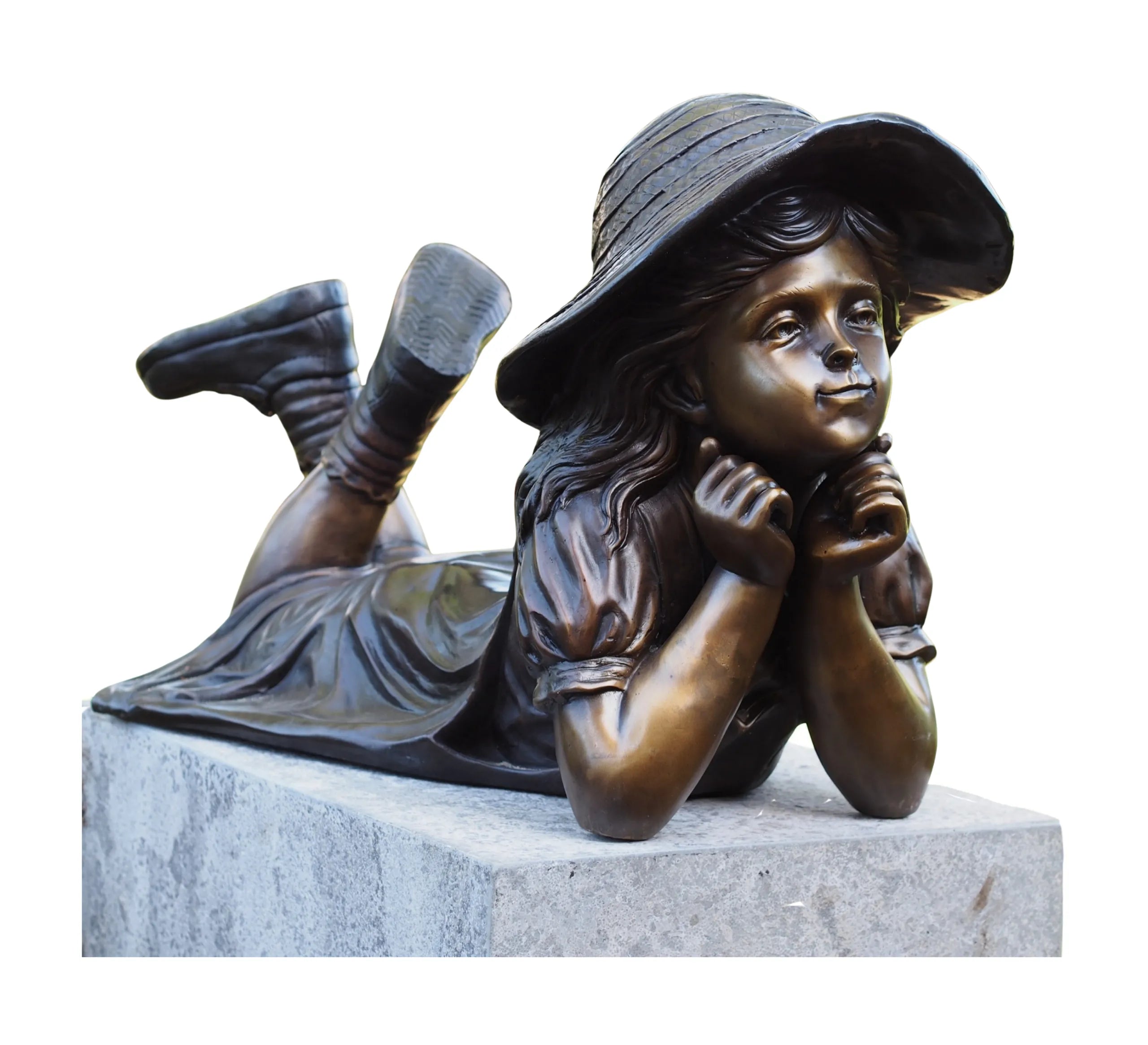 Dreaming Moments is a thoughtful bronze sculpture of a young girl lying down, her face gently resting on her hands in quiet contemplation. Capturing a moment of daydreaming and wonder, this piece evokes innocence, imagination, and peaceful reflection—an enchanting addition to gardens, reading corners, or serene outdoor spaces.