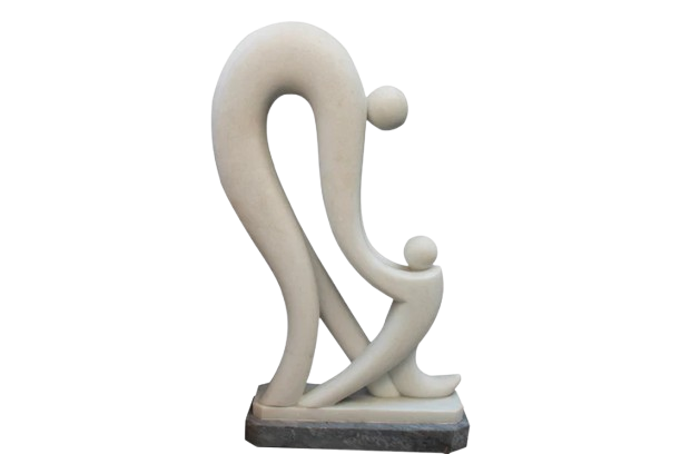 This modern marble sculpture features two intertwined abstract figures representing a parent and child. The design emphasizes unity and connection, with smooth, flowing curves forming a continuous loop. Each figure is represented by a spherical head, seamlessly integrated into the elegant composition, evoking feelings of nurturing and harmony. The base provides stability to the dynamic form. This product is ideal for both indoor and outdoors.