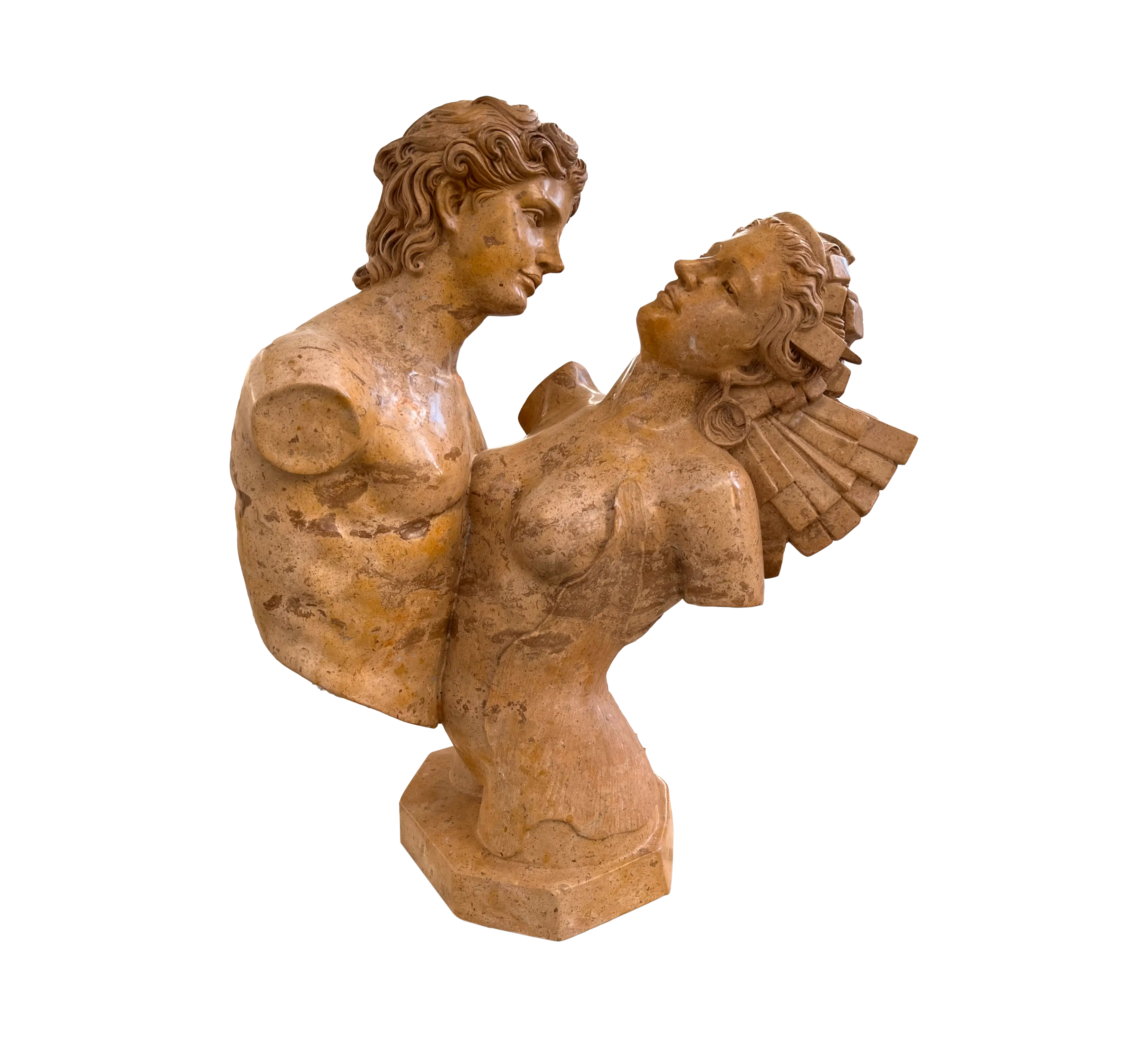 Crafted from rich brown-toned stone, Eternal Embrace captures a powerful moment of romantic intensity between two incomplete yet deeply connected figures. The sculptor has beautifully portrayed emotion through their intertwined forms, gazes locked in timeless affection. Despite the absence of limbs, the piece radiates strength, unity, and passion—an ode to love that transcends time and physicality.