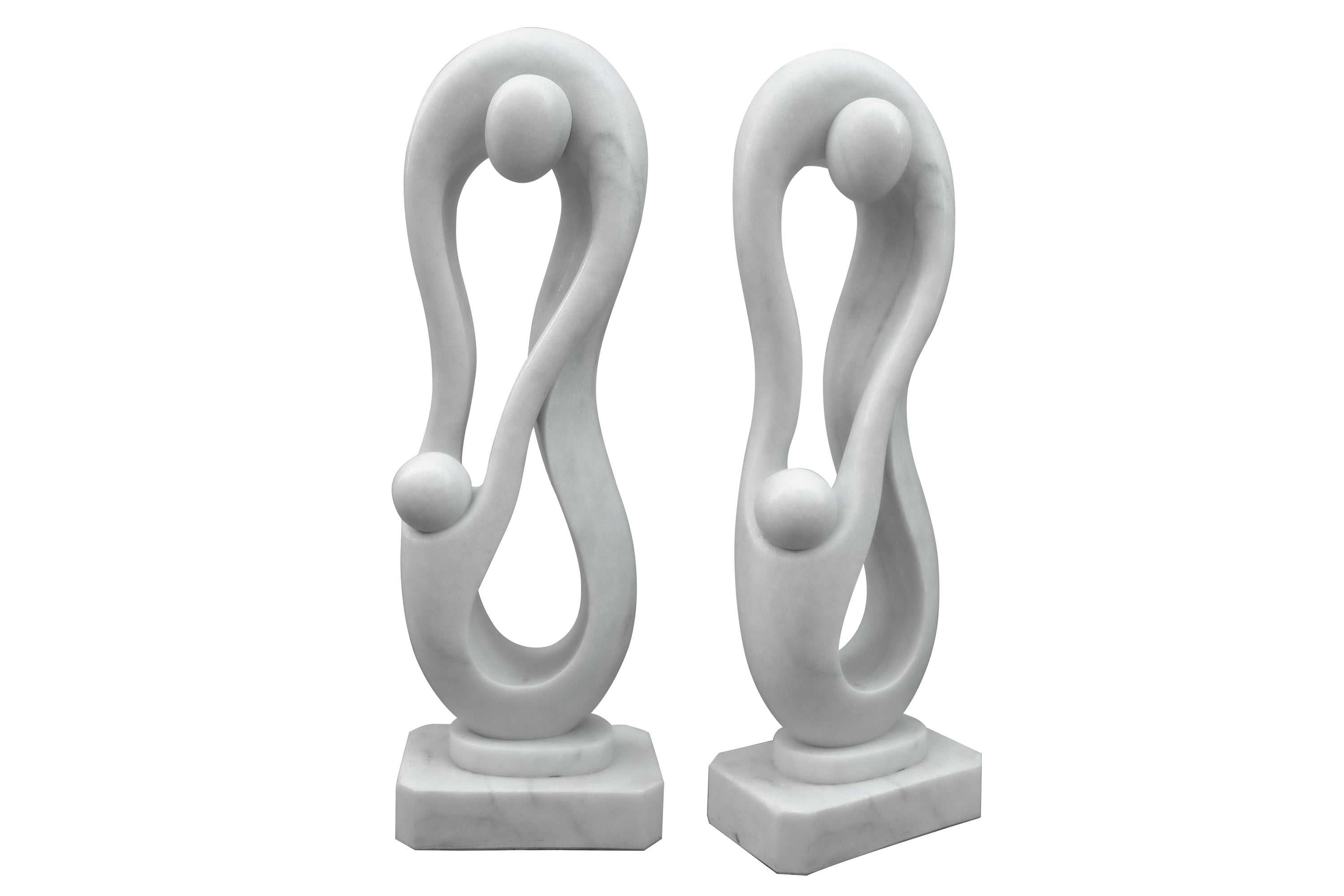 This modern marble sculpture features two intertwined abstract figures representing a parent and child. The design emphasizes unity and connection, with smooth, flowing curves forming a continuous loop. Each figure is represented by a spherical head, seamlessly integrated into the elegant composition, evoking feelings of nurturing and harmony. The base provides stability to the dynamic form. This product is ideal for both indoor and outdoors.