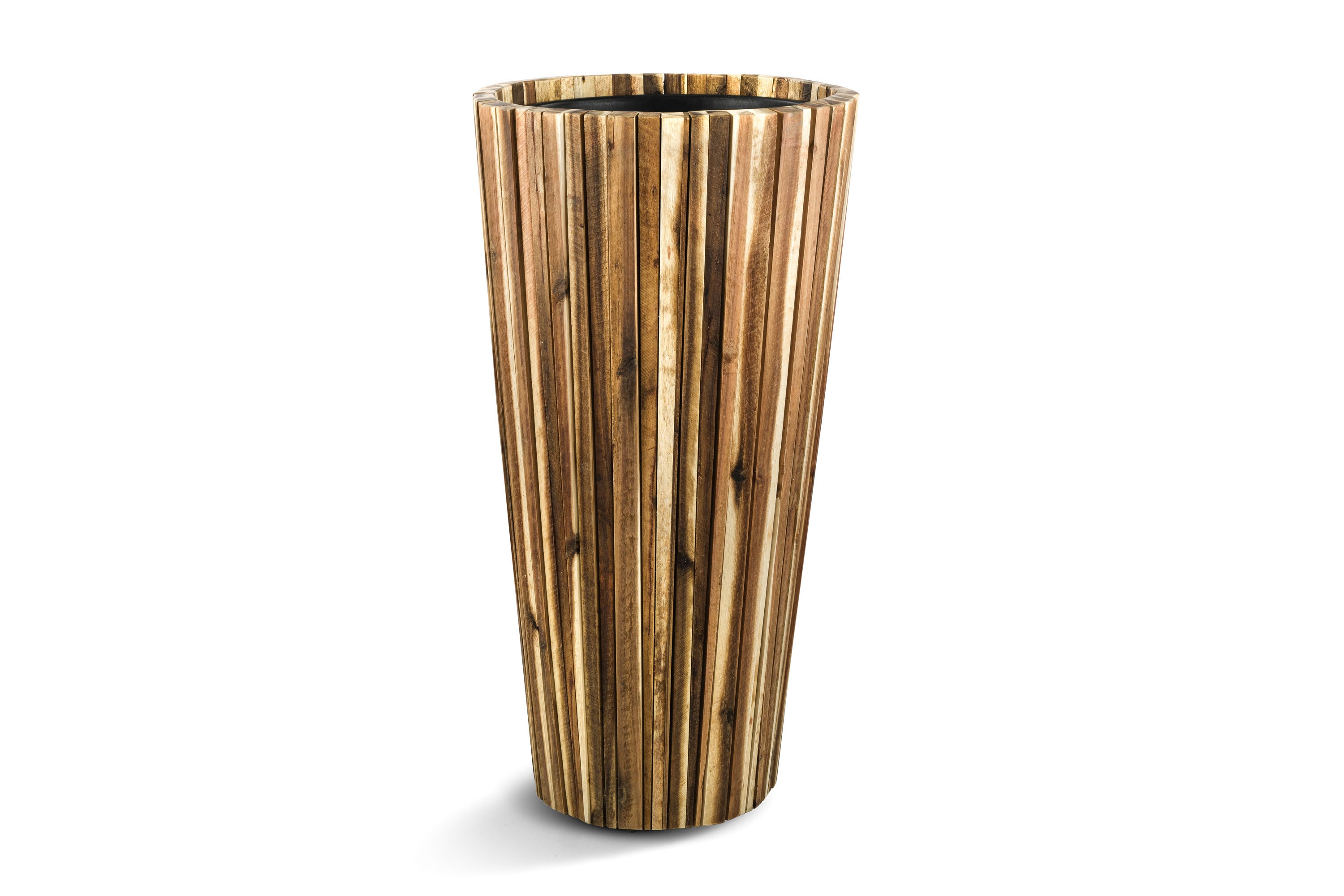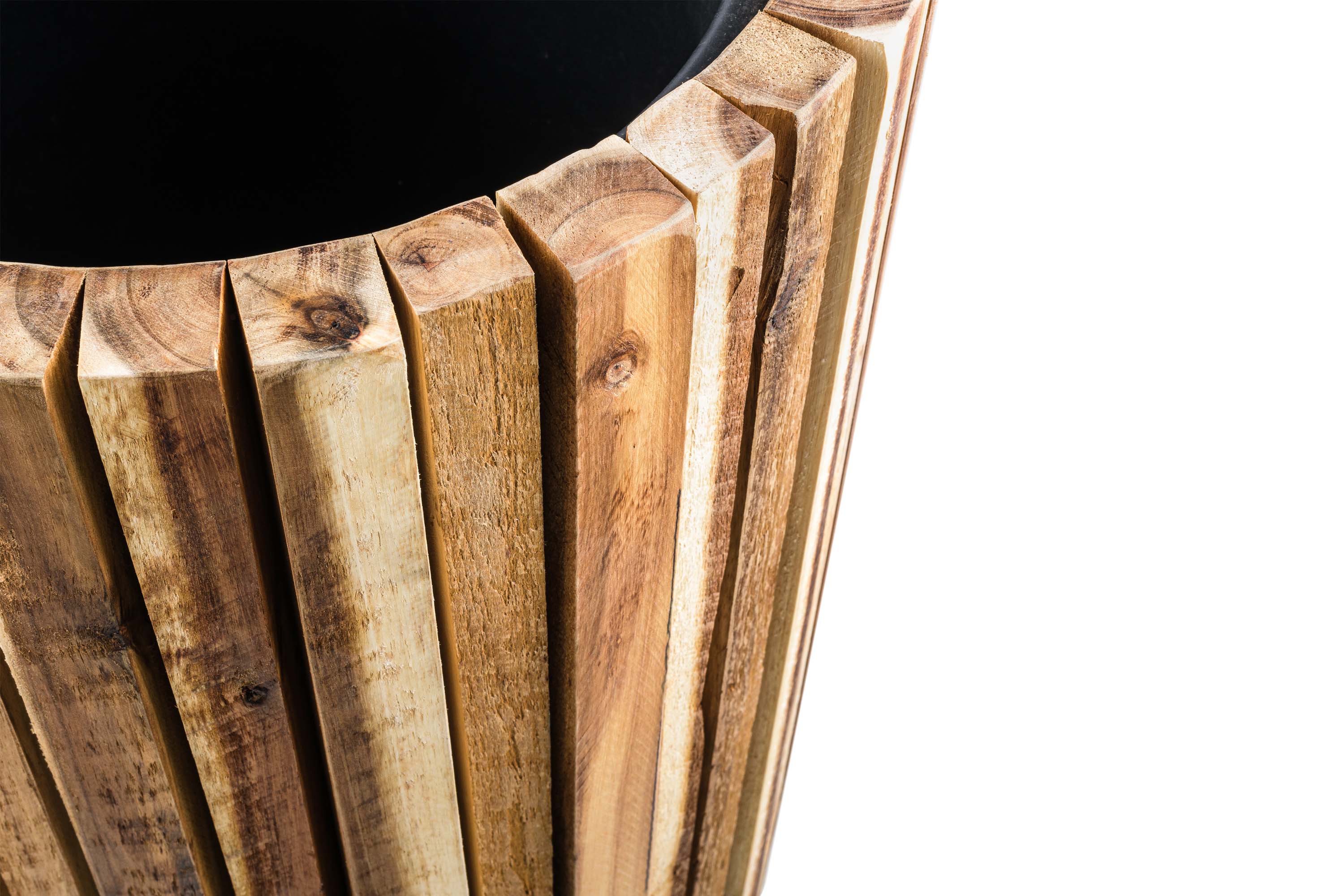 This planter is a stunning piece crafted from rich, sustainably sourced tropical wood, bringing a touch of paradise to any space. Its warm hues and natural grain patterns make each planter unique, while the smooth, polished finish enhances its elegant appearance. Designed to withstand the elements, the planter is perfect for both indoor and outdoor use, providing a beautiful home for your favorite plants. Its sturdy construction ensures durability, and its spacious interior offers ample room for roots to thrive. It comes along with watertight inserts made of recycled plastic. Whether adorning a patio, balcony, or living room, it captures the essence of tropical beauty and serenity.