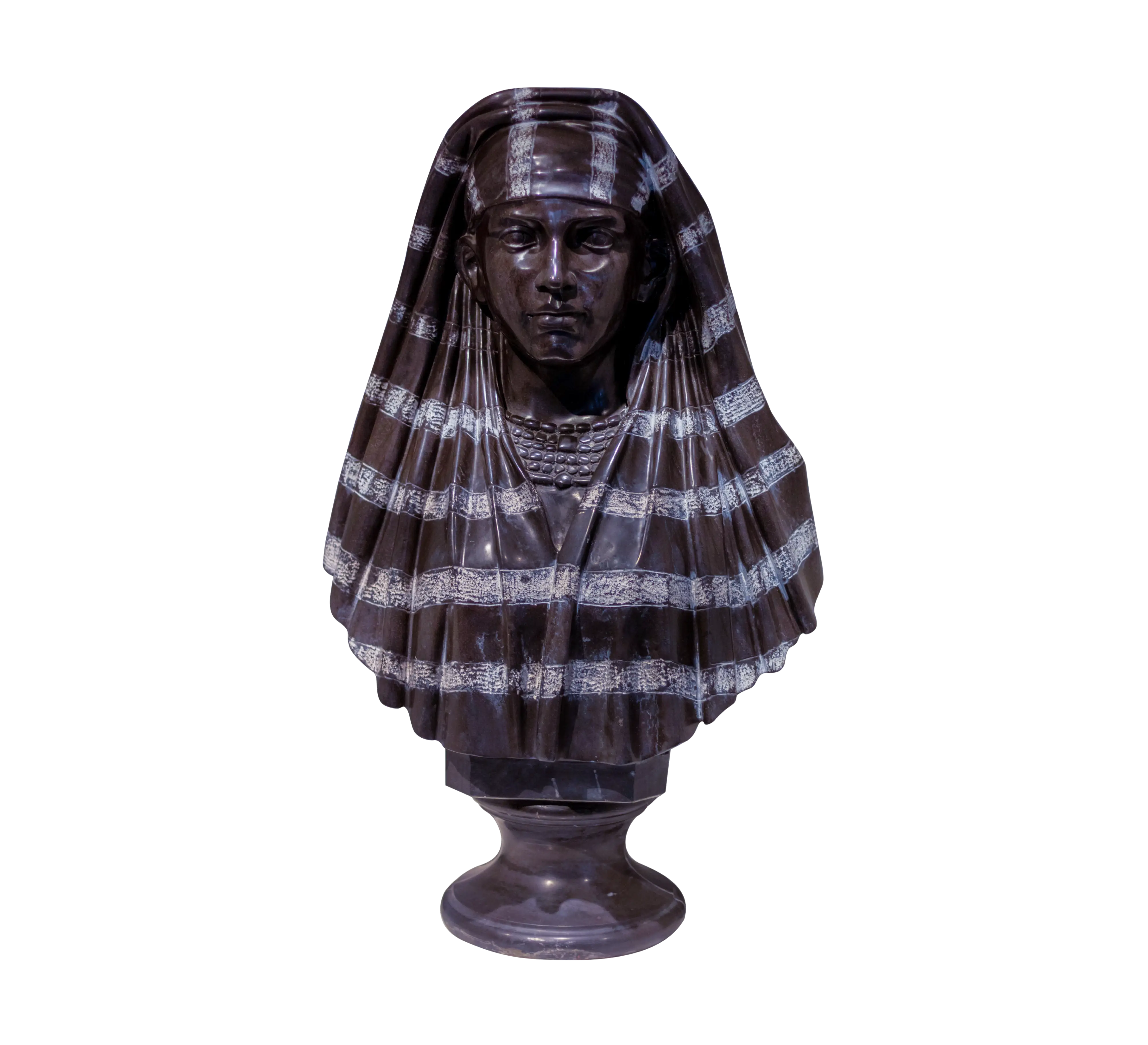 Noble of the Nile is a captivating bust sculpture carved from rich black marble, accentuated with white veining to create the appearance of a traditional striped headdress. The figure’s poised expression and intricate detailing—particularly in the beaded necklace—evoke a sense of dignity and cultural heritage. With its commanding presence and timeless elegance, this piece makes an ideal addition to luxury hotel lobbies, refined home libraries, art galleries, upscale entryways, or executive offices, where it can serve as both a conversation starter and a symbol of sophistication.