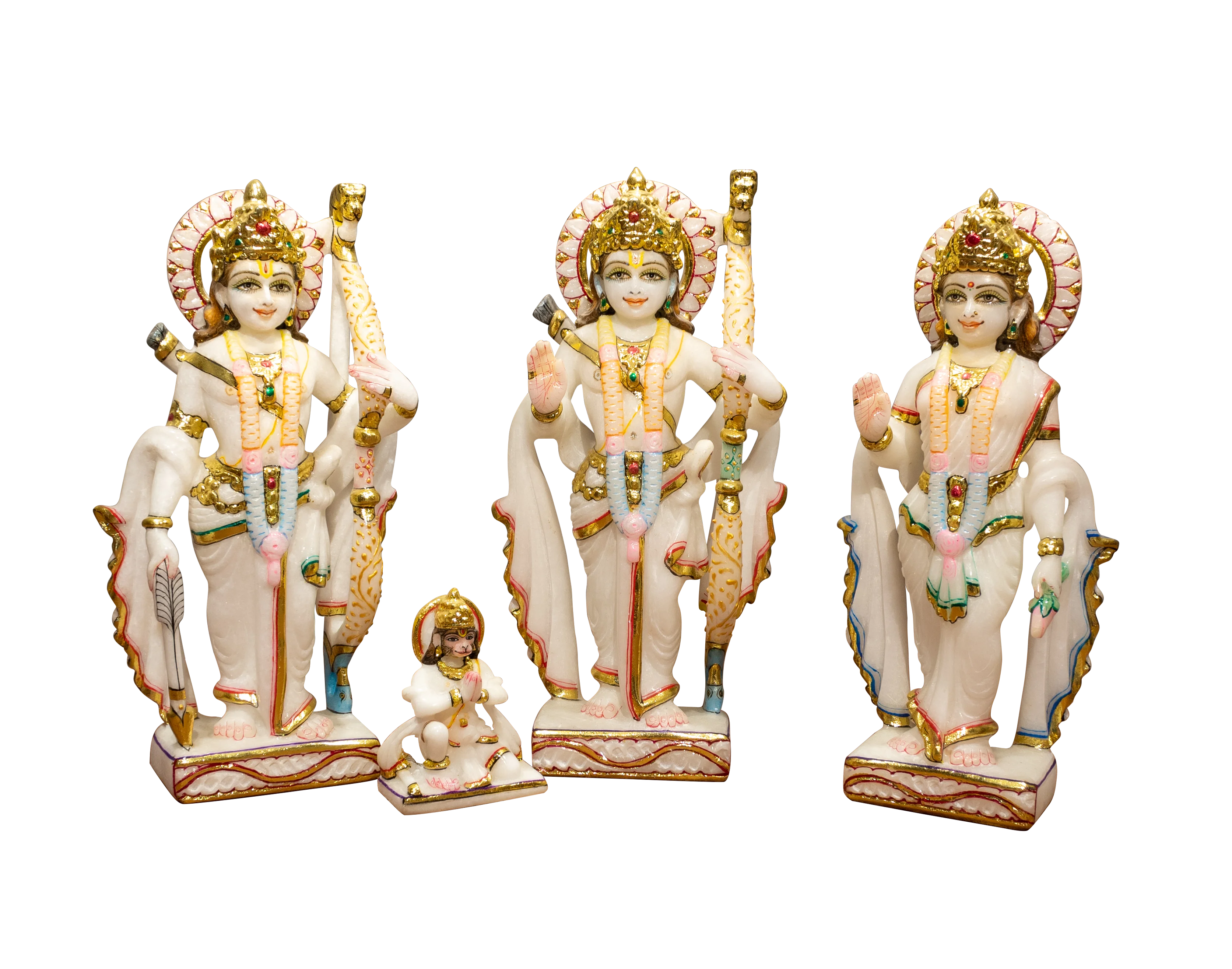 With their finely carved representations of Lord Ram Ji, Laxman Ji, Sita Ji, and Hanuman ji, these Ram Darbar sculptures are the epitome of divine grace and beauty. Their serene presence exudes dedication and serenity, and they are crafted frompristine white marble. These sculptures are a magnificent addition to any altar at home or in a place of worship, with their celestial forms enhanced by exquisite golden outlines. Perfect to be placed in your mandir.