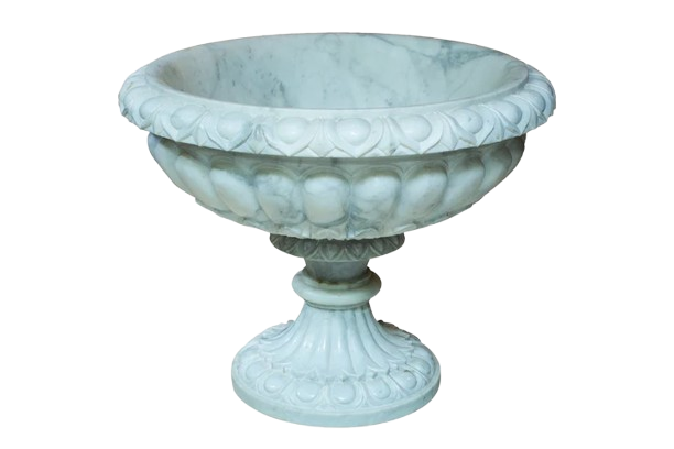 The combination of decorative elements on both the bowl and the pedestal suggests that this piece was inspired by neoclassical or Renaissance styles, where intricate carvings were often employed to convey elegance and sophistication."