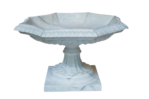 "This bowl is an ornate, pedestal-style piece made from marble, featuring a hexagonal or multi-faceted shape. The rim of the bowl is carved with decorative geometric and leaf motifs, which add texture and visual interest, while the deep basin is slightly flared and rests elegantly on a carved pedestal.