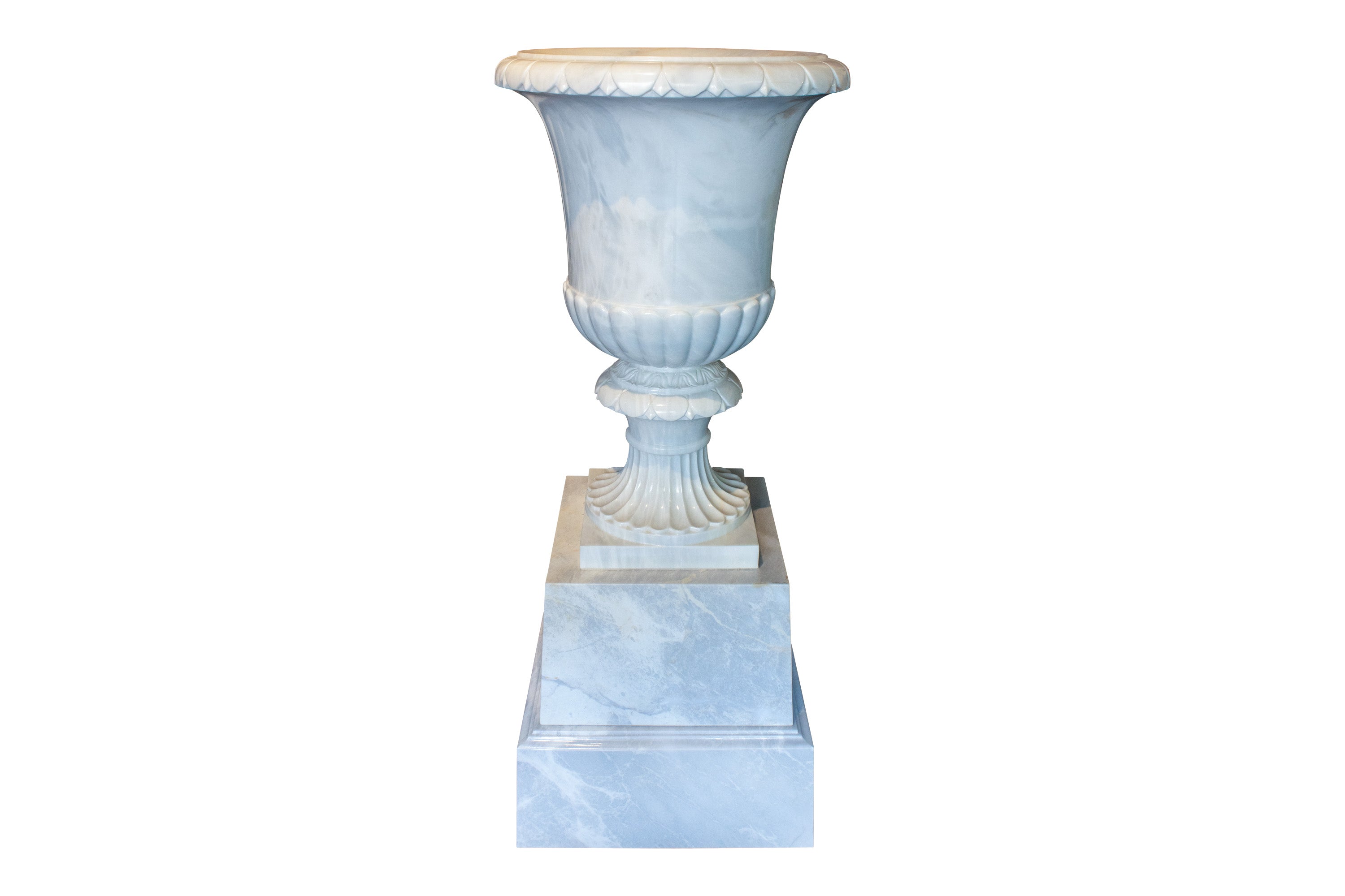 "This planter features an elegant and classical design, crafted in a smooth marble. The planter is shaped like a large, flared urn, reminiscent of ancient Greek or Roman styles. Its wide rim has decorative carvings resembling petal-like shapes, giving it a floral motif. The base pedestal is simple yet substantial, providing a stable foundation to the ornate urn.