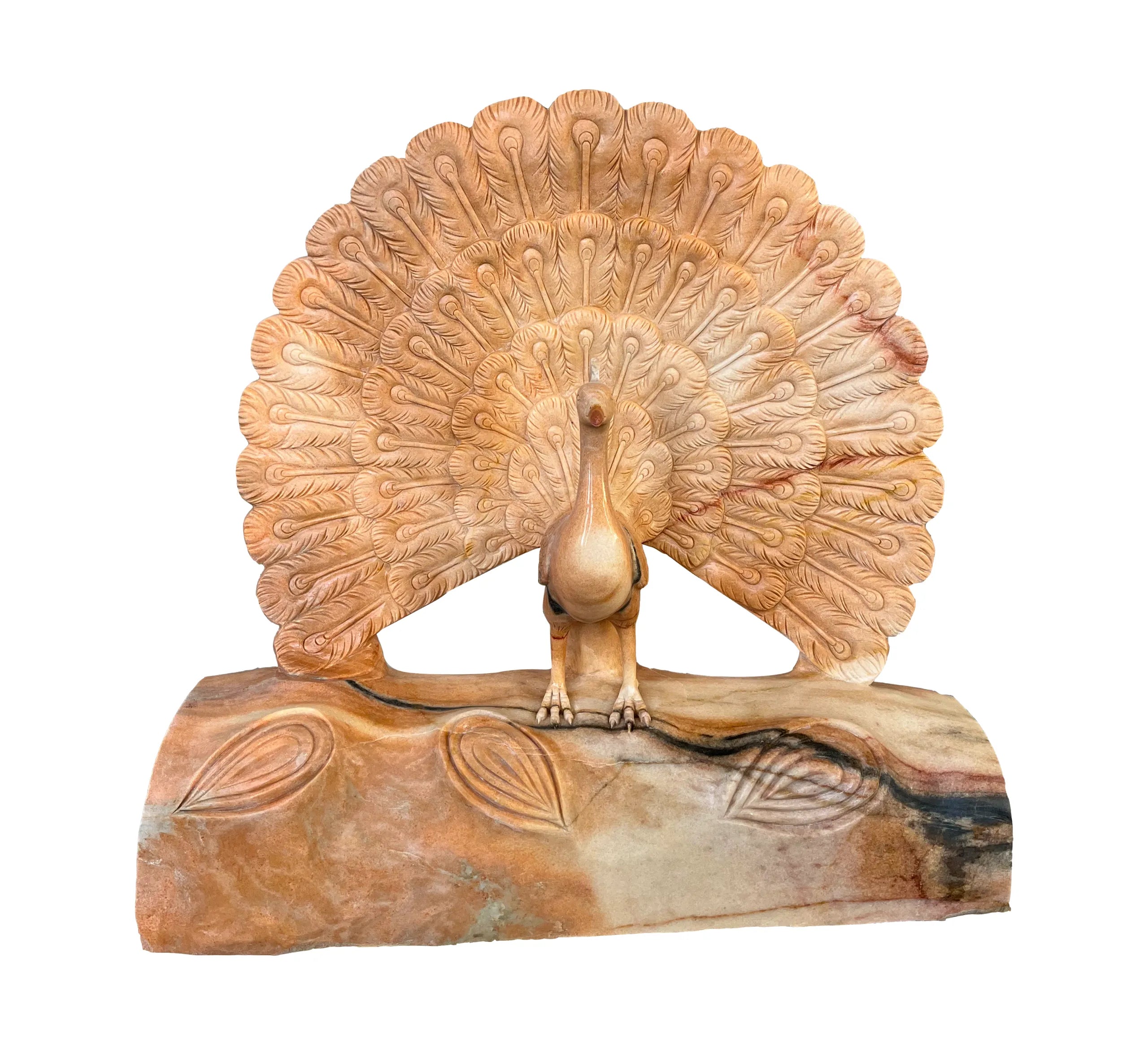 The Joyful Dance is a breathtaking marble sculpture of a peacock with its magnificent feathers fully spread, captured in a moment of graceful, joyful dance. Carved from soft pink marble, the sculpture highlights the intricate details of the peacock's elegant plumage, each feather delicately sculpted to convey fluid motion and vibrant energy. The peacock’s posture, with its head held high and body poised in mid-dance, symbolizes beauty, grace, and celebration. Perfect as a focal point at an entrance or placed in the garden, The Joyful Dance adds a lively, sophisticated touch to any space, welcoming guests with its radiant charm and joyful spirit.