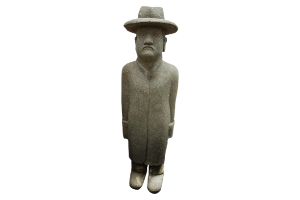 This modern sculpture portrays a stoic figure wearing a hat and a coat, characterized by minimalist yet expressive carving that evokes timeless dignity.