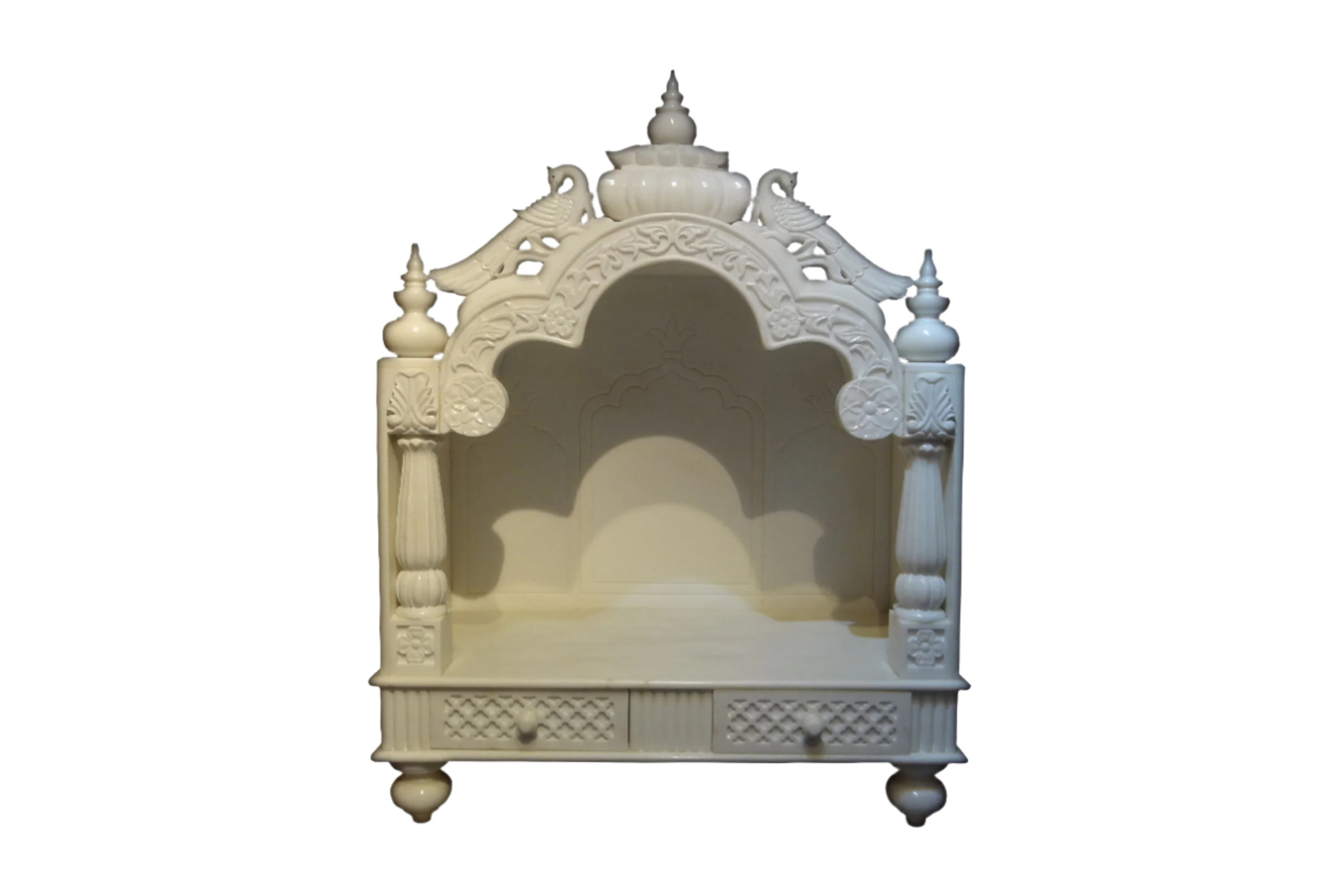 A hand-carved white marble mandir epitomizes the zenith of artisanal craftsmanship and spiritual elegance. Fashioned from the finest quality white marble, each mandir is a masterpiece, adorned with intricate carvings that depict divine motifs and exquisite floral patterns, reflecting a profound reverence for the sacred. Its lustrous surface exudes an air of opulence, creating a serene sanctuary for worship and meditation. Customizable to suit individual aesthetics, these mandirs seamlessly blend artistry with tradition, serving as a timeless centerpiece that elevates the spiritual ambiance of any abode.